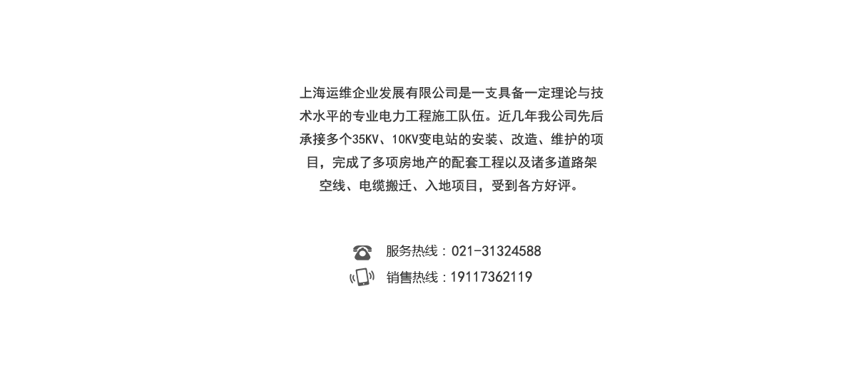 上海运维企业发展有限公司,办公地点:上海浦东新区合庆镇益华路986号;注册资金:人民币3000万元。公司资质:输变电工程专业承包叁级、电力工程施工总承包叁级,电监委《承装(修、试)电力设施许可证》四级,并通过ISO9001质量管理体系、职业健康安全管理体系、环境管理体系认证。公司现有项目经理、二级建造师13人,企业在册有职称的工程技术管理人员25名,持电网许可证工人30名,是一支具备一定理论与技术水平的专业电力工程施工队伍。近几年我公司先后承接多个35KV、10KV变电站的安装、改造、维护的项目,完成了多项房地产的配套工程以及诸多道路架空线、电缆搬迁、入地项目,受到各方好评。我公司在电力工程市场中将不断发展开拓,愿意为上海电力建设作贡献。公司使命:“让一度电创造更多价值”。